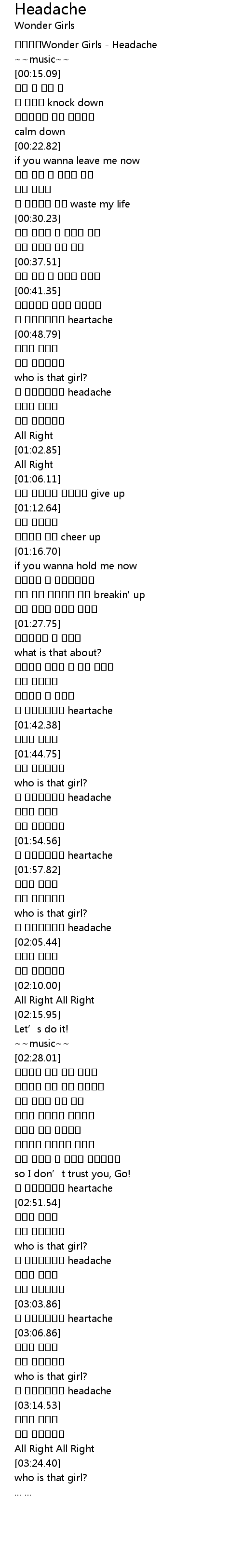 | [00:00.89] | 원더걸스Wonder Girls - Headache |