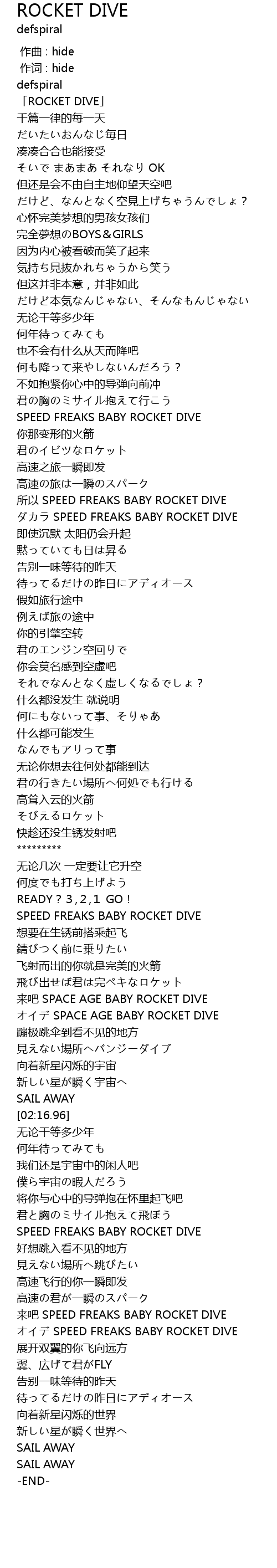 | [03:08.45] | 来吧 SPEED FREAKS BABY ROCKET DIVE |