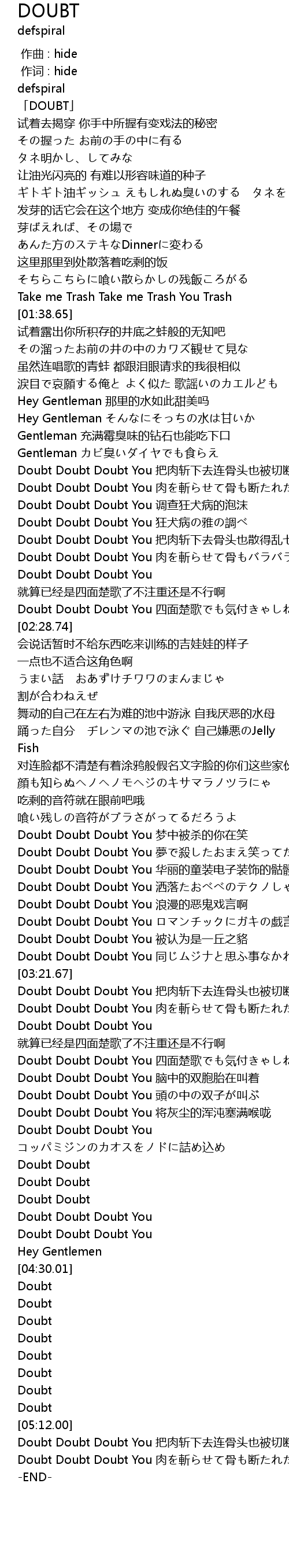| [02:59.04] | Doubt Doubt Doubt You 夢で殺したおまえ笑ってた |
