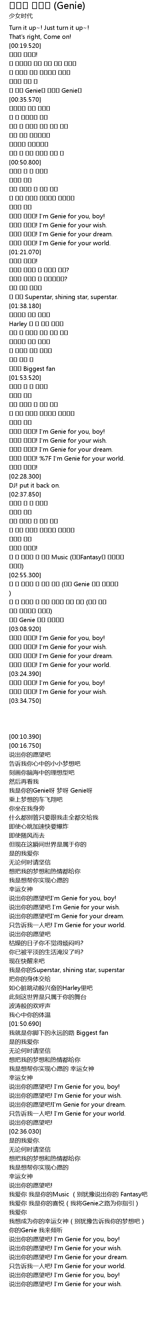 | [03:17.600] | 소원을 말해봐! I'm Genie for your dream. |