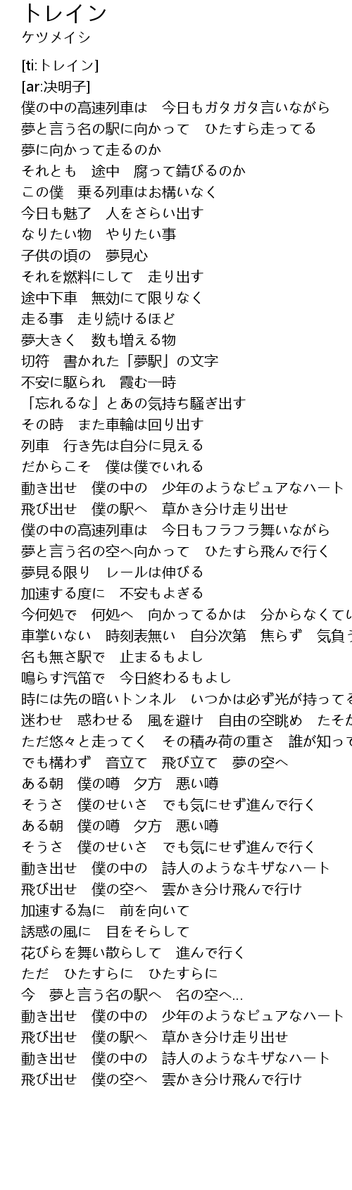 | [00:31.882] | 僕の中の高速列車は 今日もガタガタ言いながら |