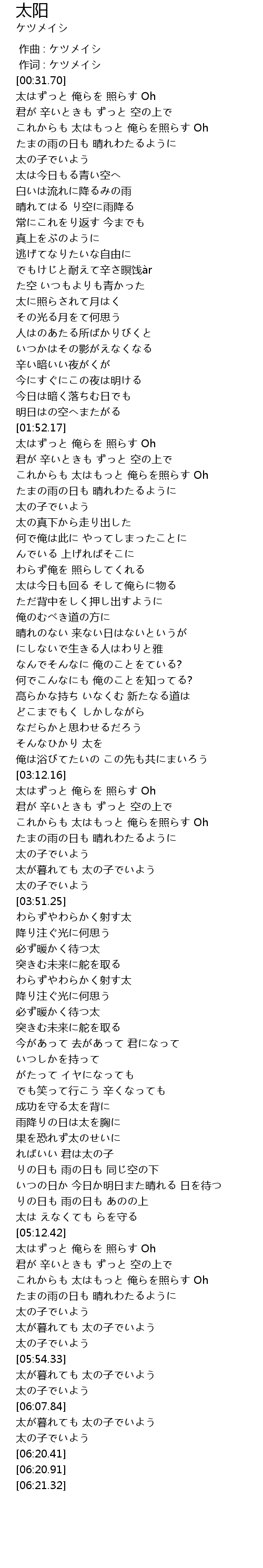 | [05:27.34] | これからも 太はもっと 俺らを照らす Oh |