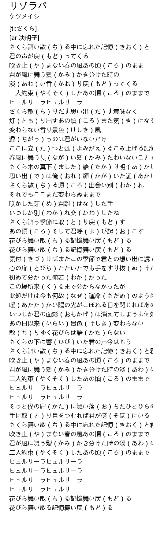 | [00:15.51] | さくら舞い散(ち)る中に忘れた記憶(きおく)と |