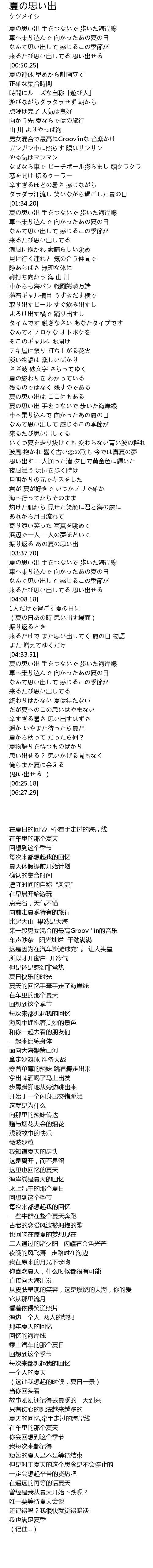 | [01:34.74] | 夏の思い出 手をつないで 歩いた海岸線 |