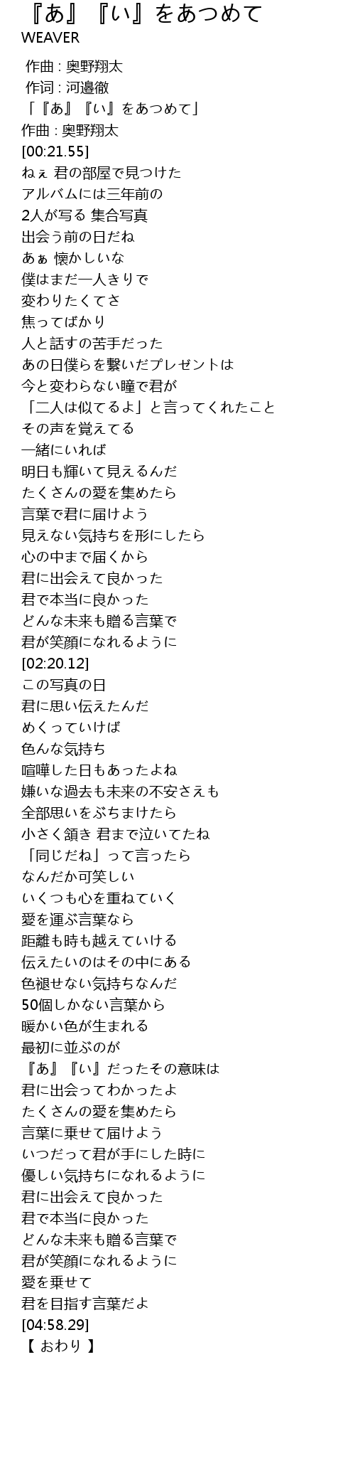 | [00:01.55] | 「『あ』『い』をあつめて」 |