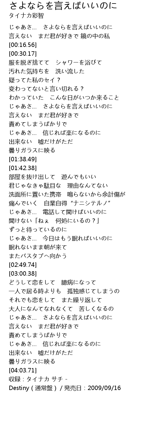 | [04:05.71] | 収録:タイナカ サチ - Destiny(通常盤)/発売日:2009/09/16 |