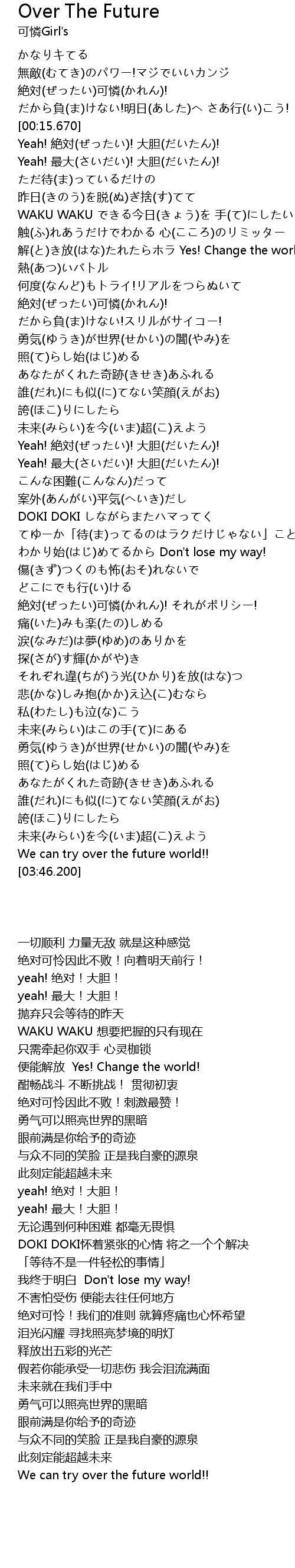 | [00:08.960] | 絶対(ぜったい)可憐(かれん)! だから負(ま)けない!明日(あした)へ さあ行(い)こう! |