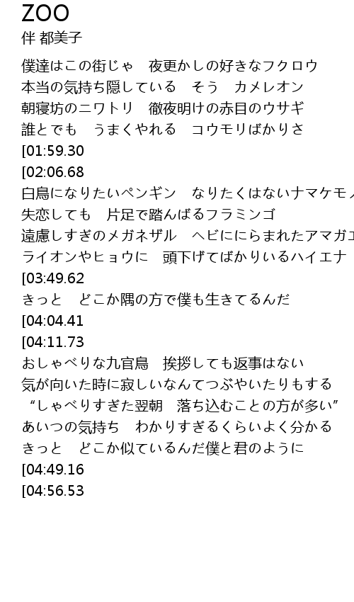 | [02:39.39][04:11.73] | 愛を下さい Oh…愛を下さい ZOO' ZOO |