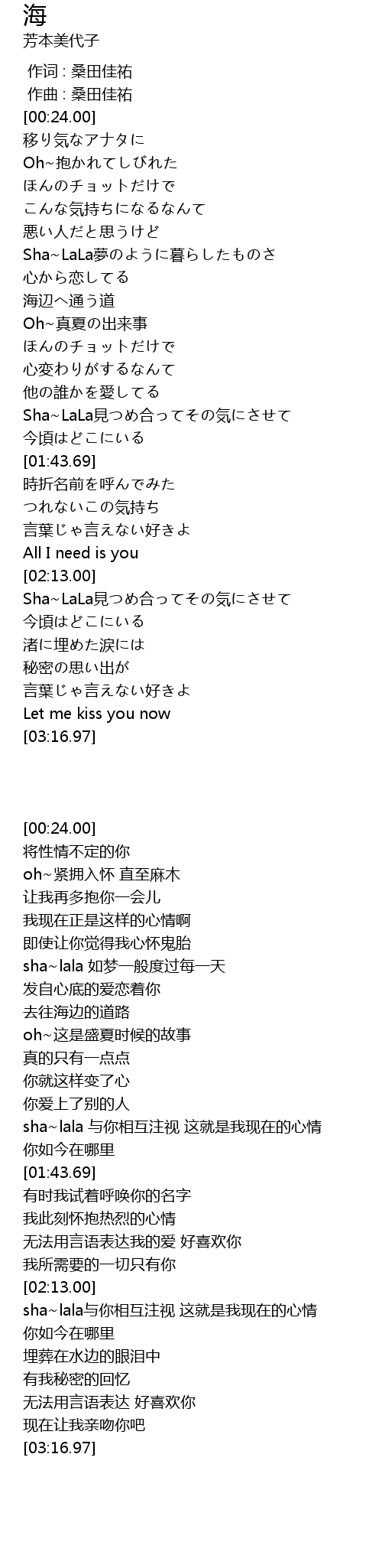 | [01:31.69] | sha~lala 与你相互注视 这就是我现在的心情 |