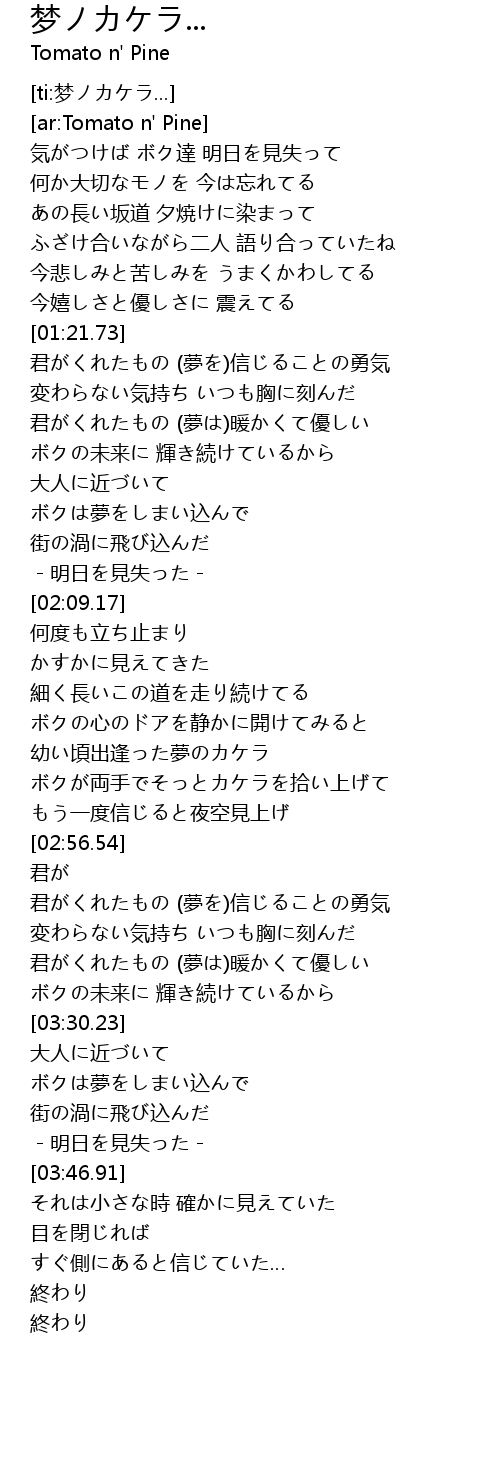 | [01:21.81] | 君がくれたもの (夢を)信じることの勇気 |