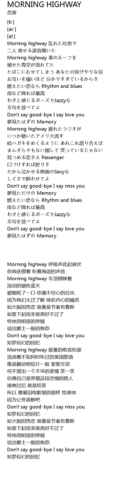 | [00:23.36] | Morning highway 乱れた吐息で |