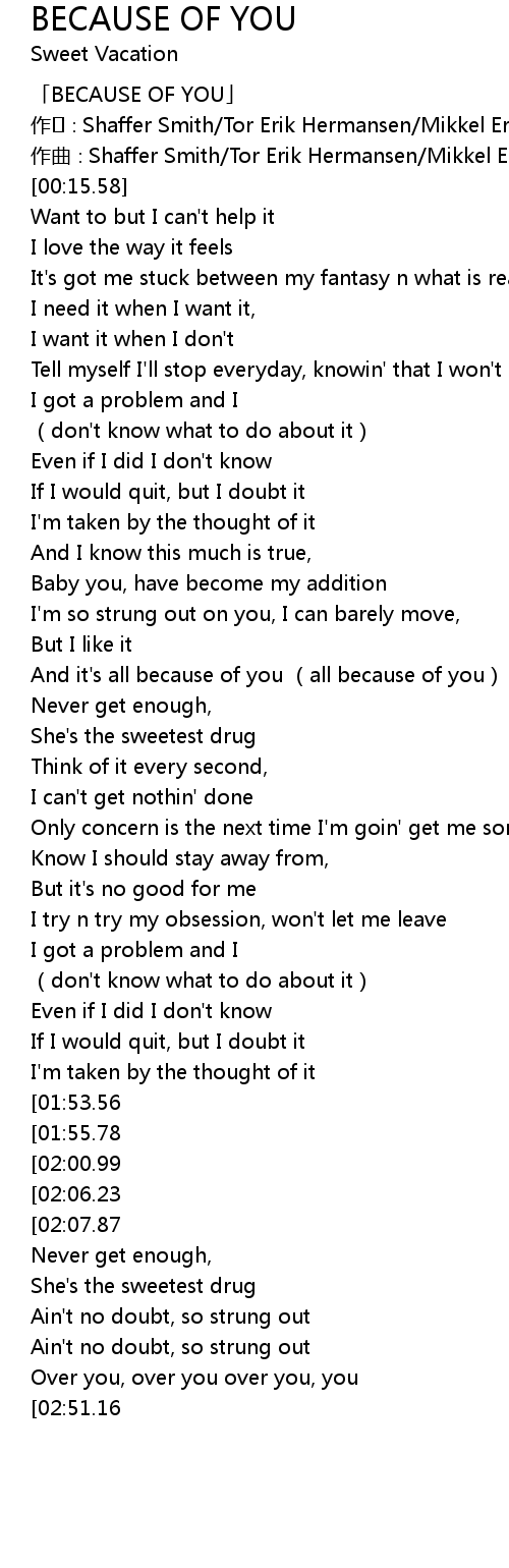 | [00:01.58] | 「BECAUSE OF YOU」 |