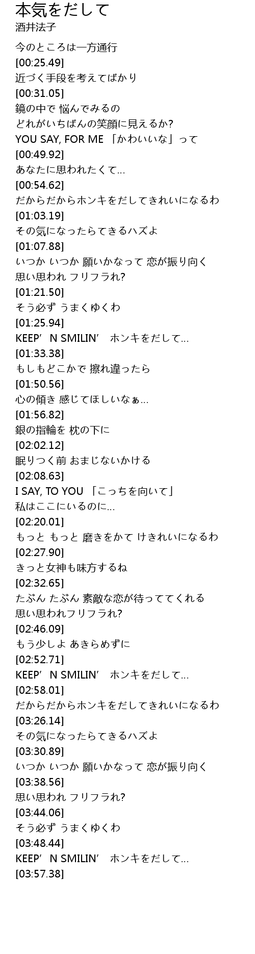 | [03:19.46] | だからだからホンキをだしてきれいになるわ |