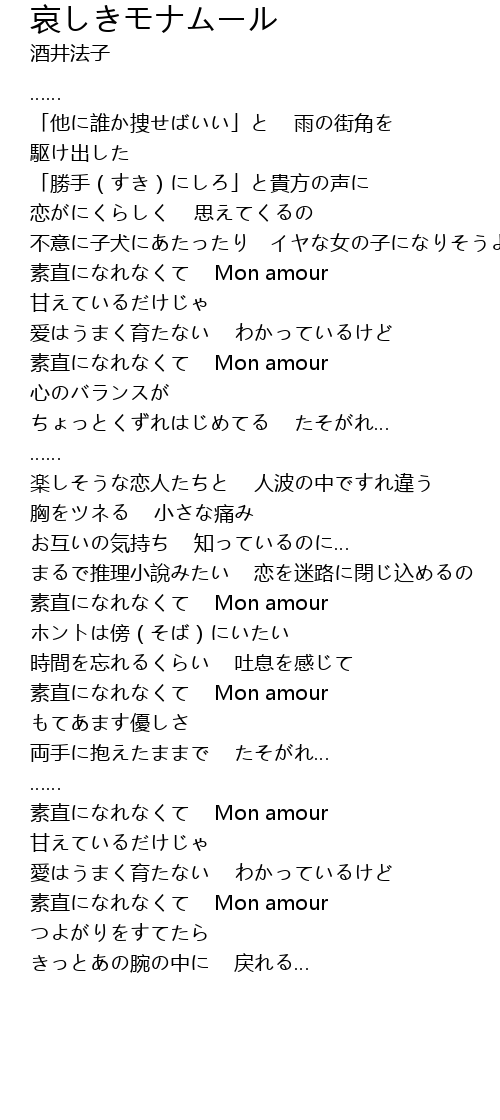 | [00:48:75] | 「勝手(すき)にしろ」と貴方の声に 恋がにくらしく 思えてくるの |