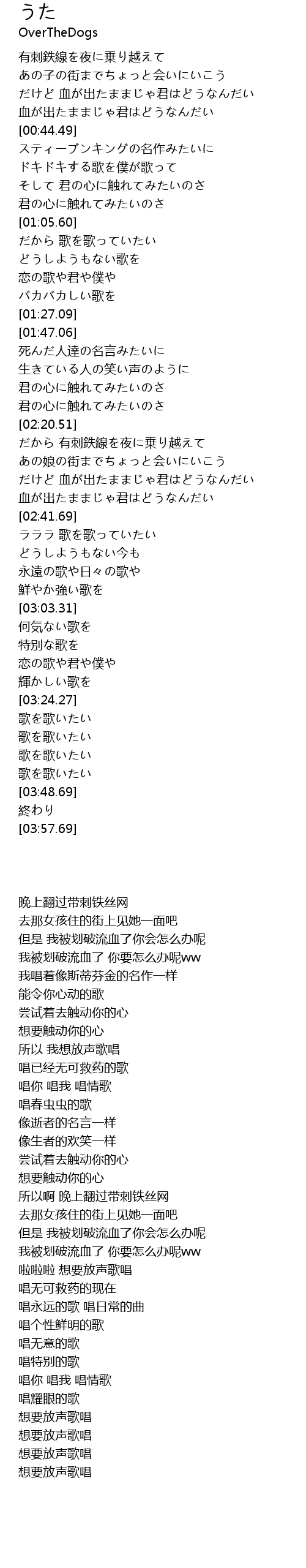 | [02:21.72] | だから 有刺鉄線を夜に乗り越えて |
