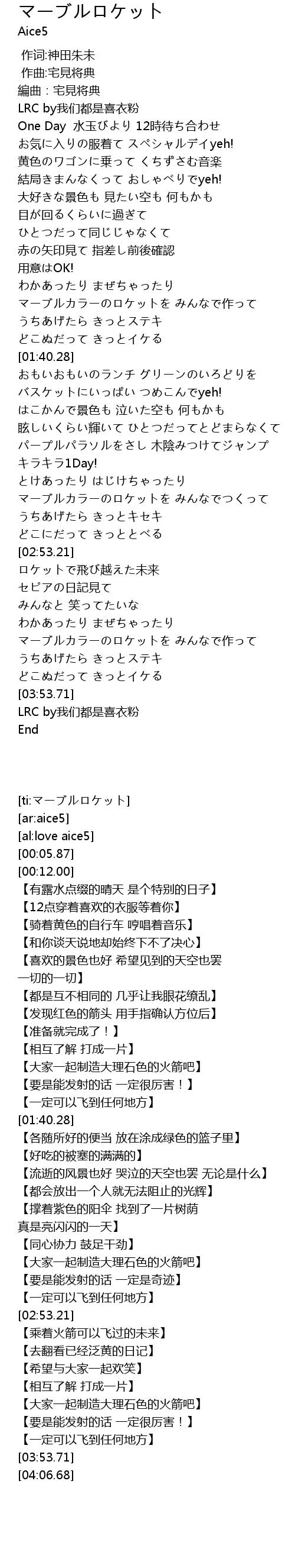 | [02:31.66] | マーブルカラーのロケットを みんなでつくって |