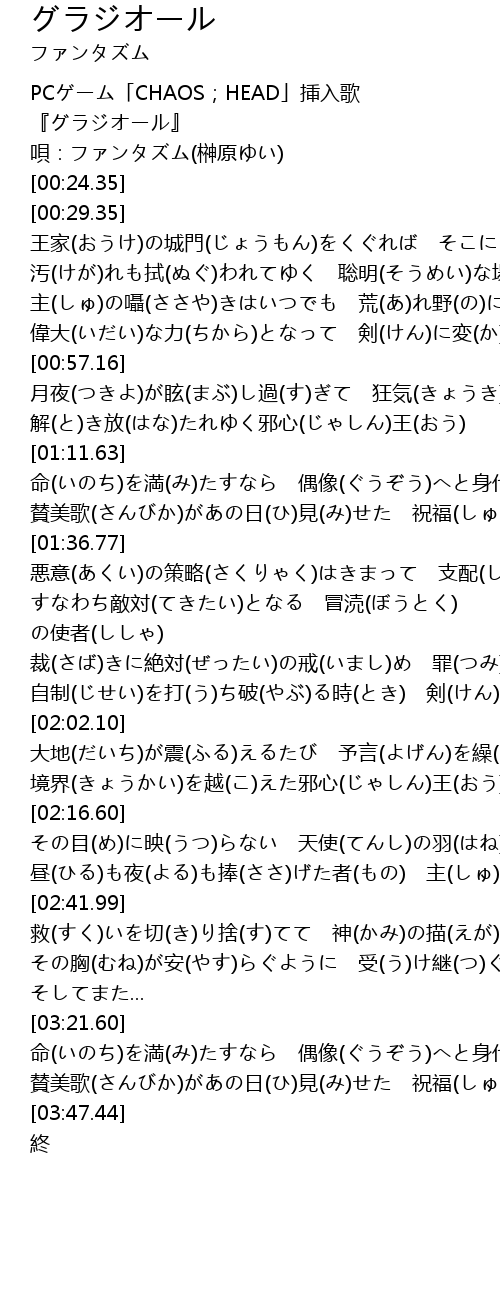 | [00:19.35] | 唄:ファンタズム(榊原ゆい) |