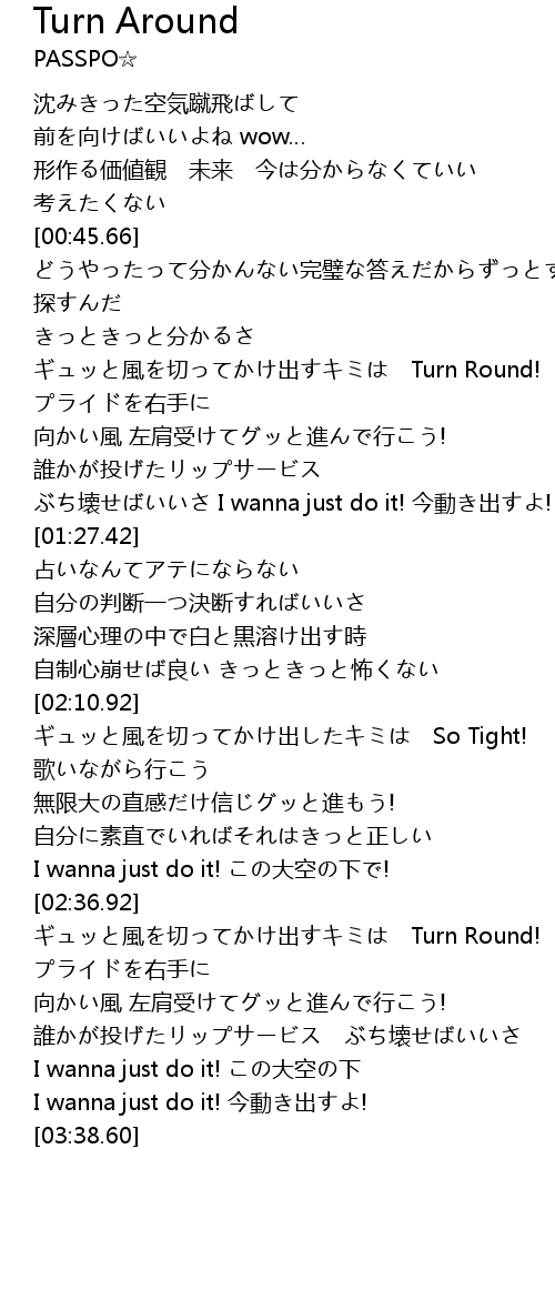 | [01:01.61] | ギュッと風を切ってかけ出すキミは Turn Round! |