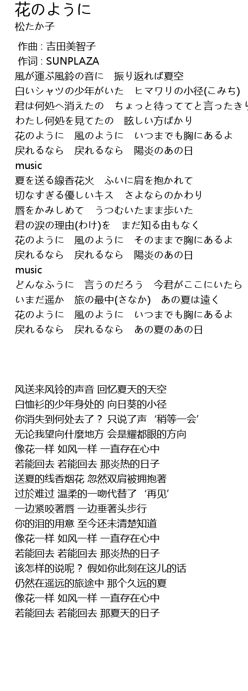 | [03:39.50] | 花のように 風のように いつまでも胸にあるよ |