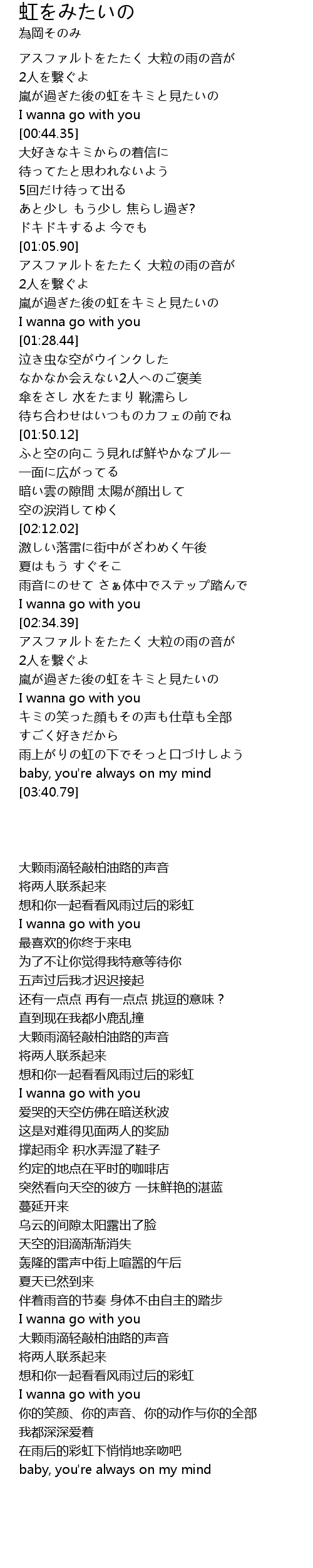 | [00:33.30] | 嵐が過ぎた後の虹をキミと見たいの |