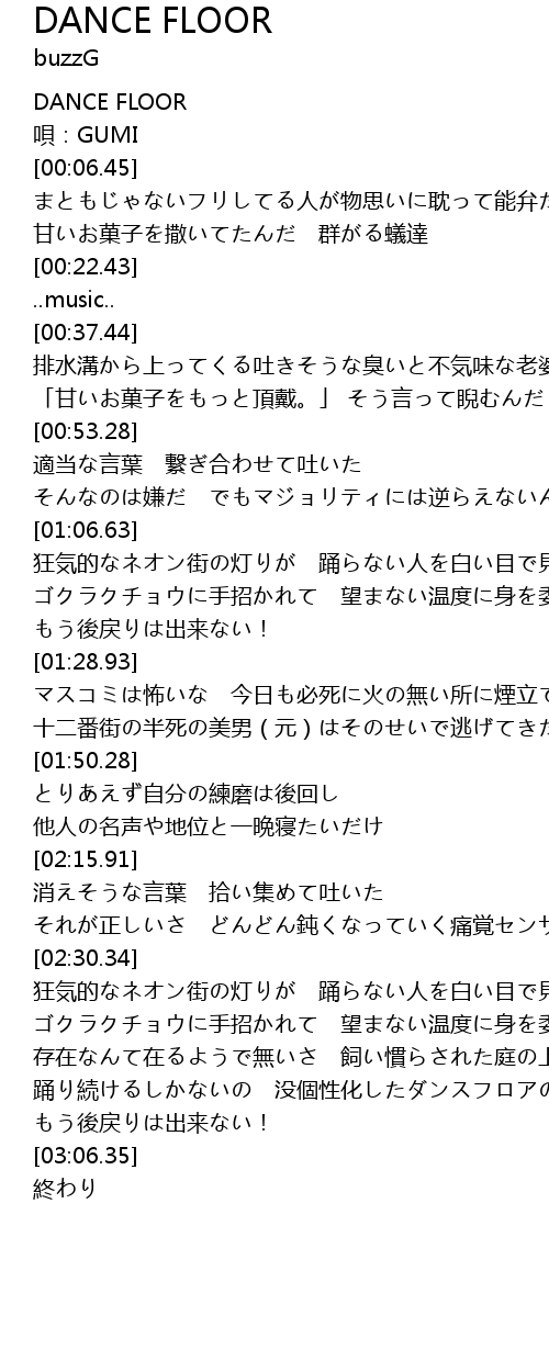 | [02:52.05] | 踊り続けるしかないの 没個性化したダンスフロアの片隅で |