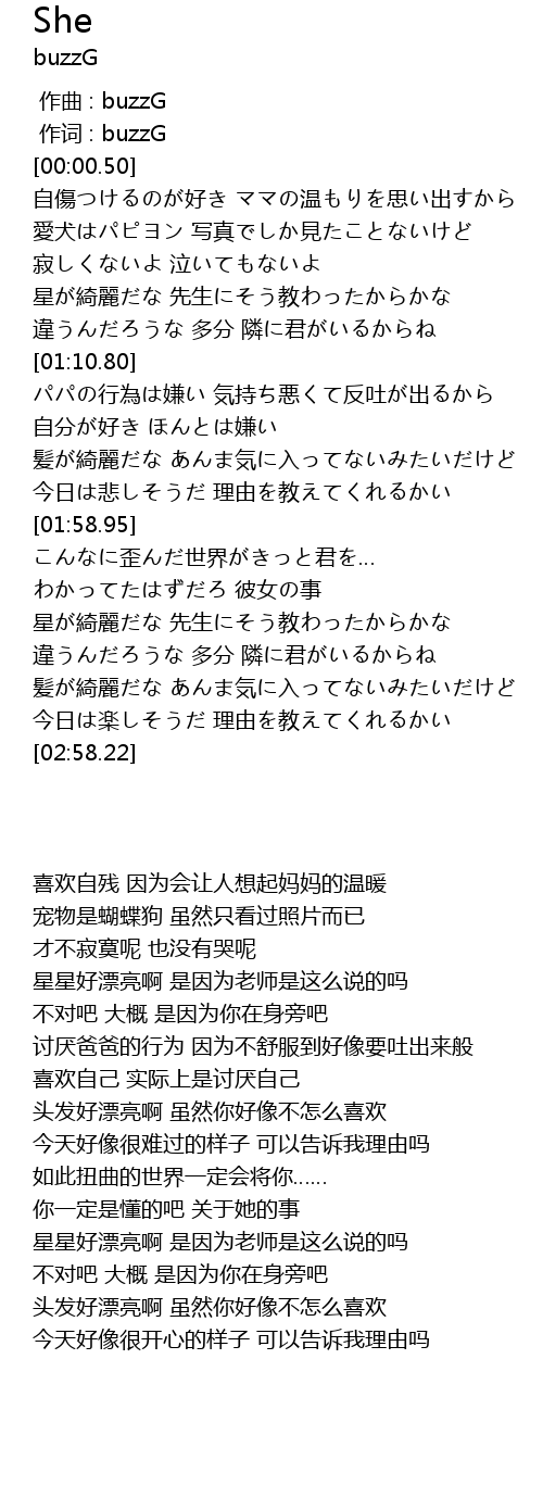 | [00:22.04] | 自傷つけるのが好き ママの温もりを思い出すから |
