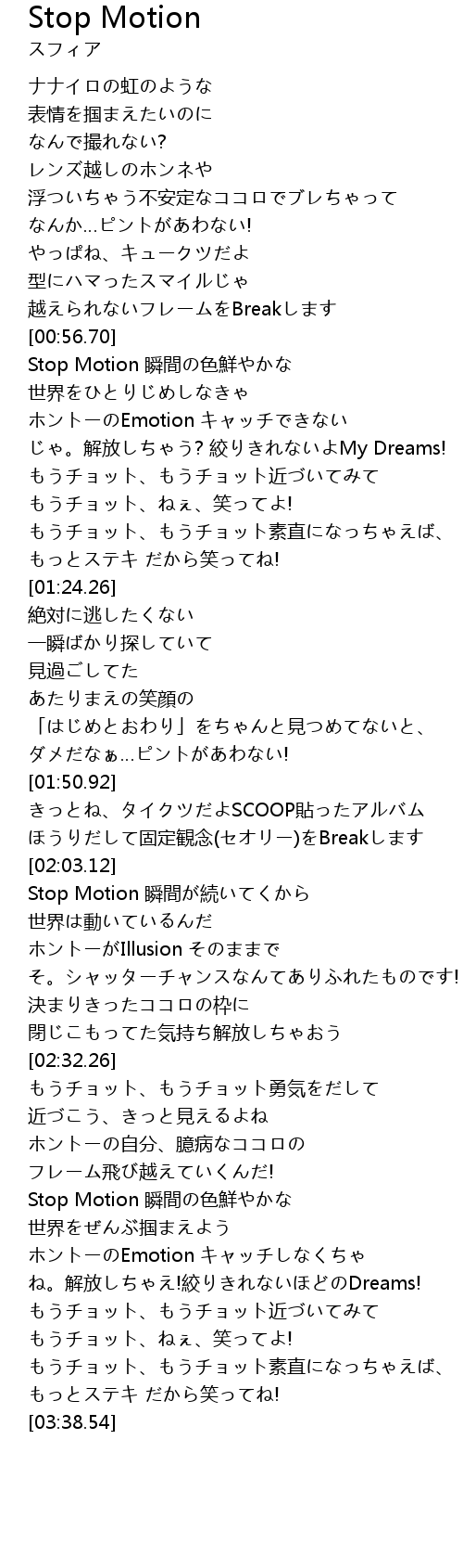 | [02:05.06] | Stop Motion 瞬間が続いてくから |