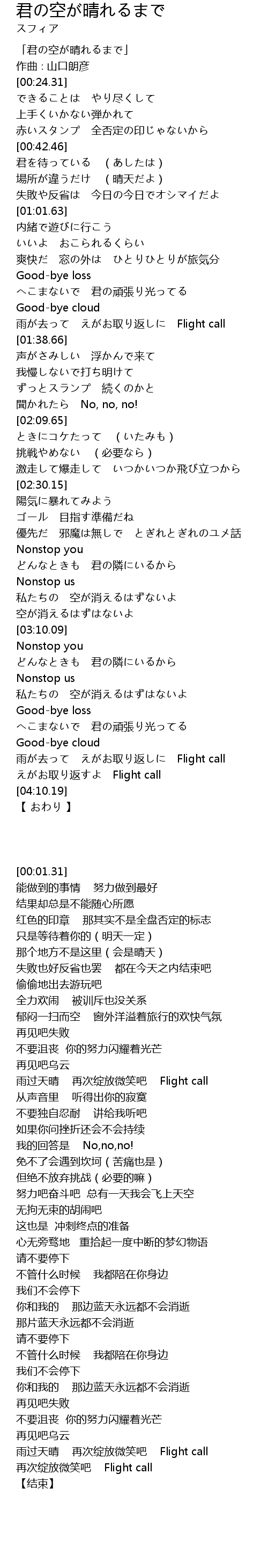 | [01:31.70] | 雨过天晴 再次绽放微笑吧 Flight call |