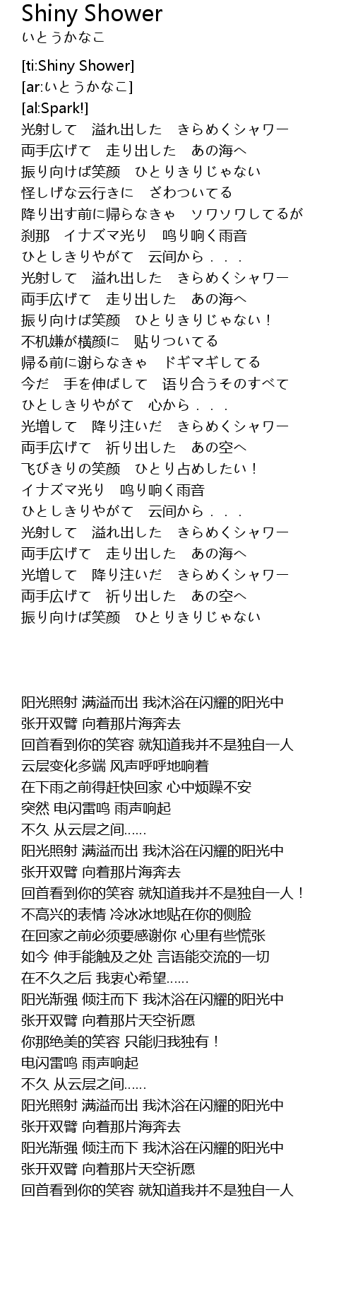 | [00:00.00] | 光射して 溢れ出した きらめくシャワー |