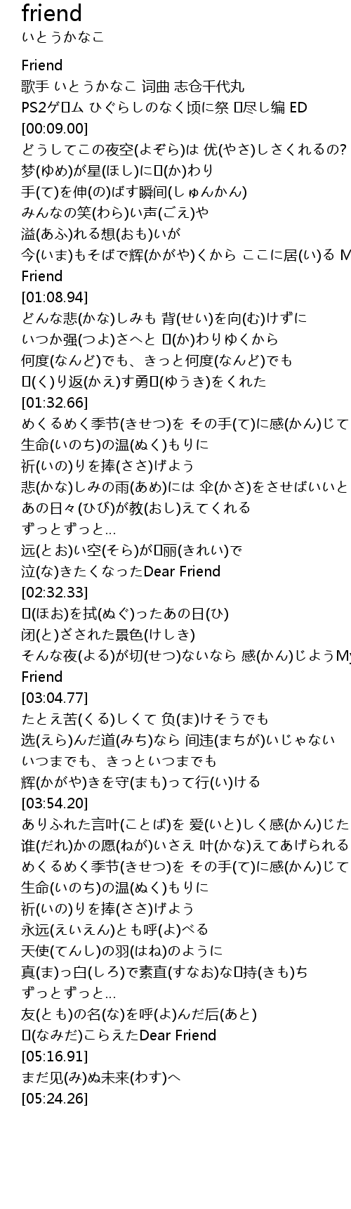 | [05:06.36] | 友(とも)の名(な)を呼(よ)んだ后(あと) �(なみだ)こらえたDear Friend |