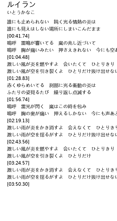 | [03:04.58] | 激しい風が炎を燃やすよ 会いたくて ひとりきり |