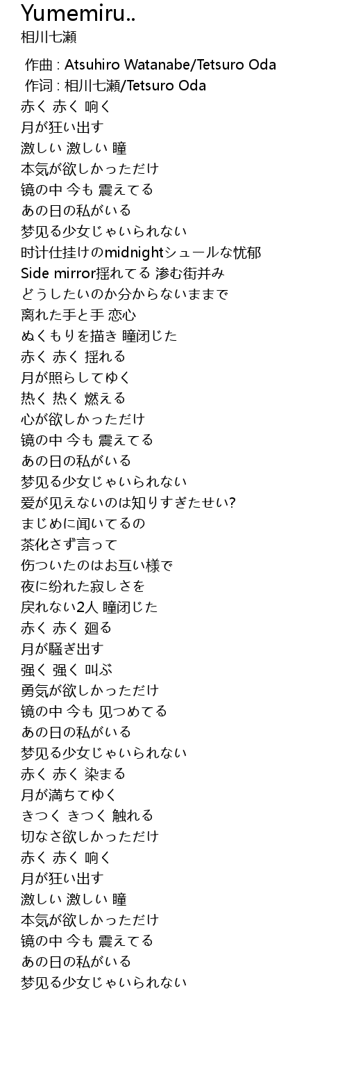 | [00:01.00] | 作词 : 相川七瀬/Tetsuro Oda |