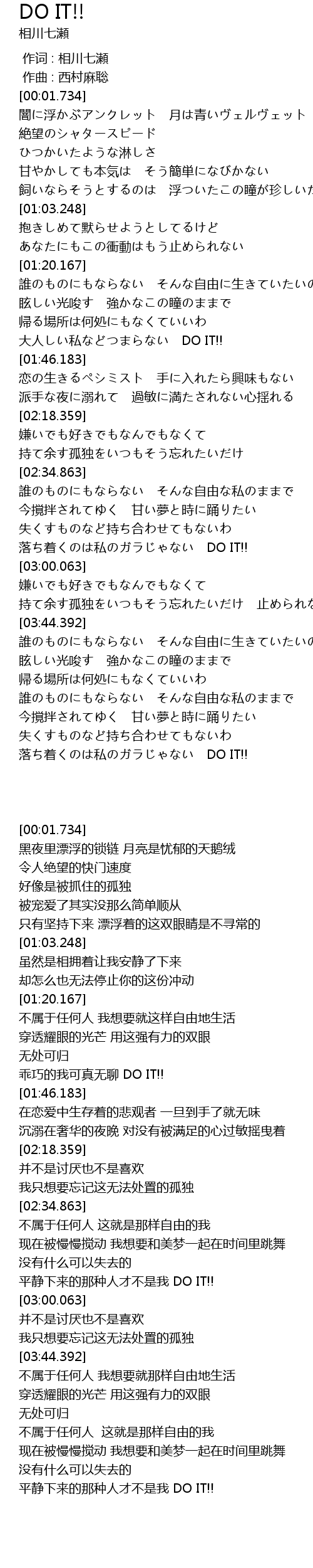 | [01:40.438] | 大人しい私などつまらない DO IT!! |