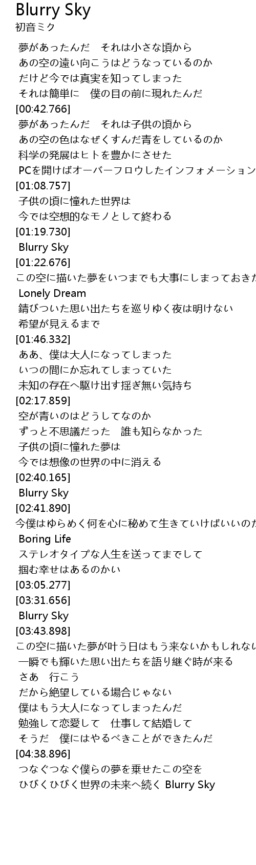 | [04:45.050] | ひびくひびく世界の未来へ続く Blurry Sky |