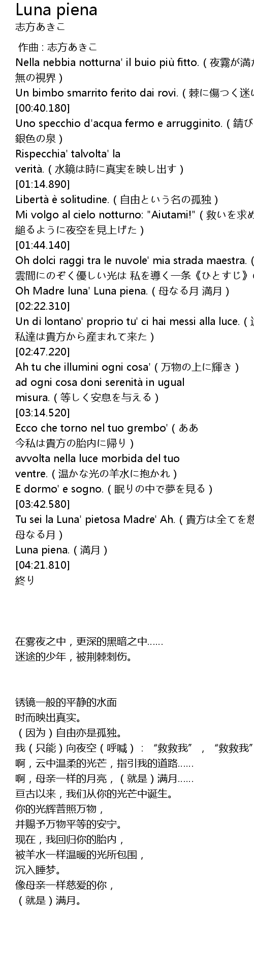 | [03:51.810] | Tu sei la Luna' pietosa Madre' Ah.(貴方は全てを慈しむ 母なる月) |