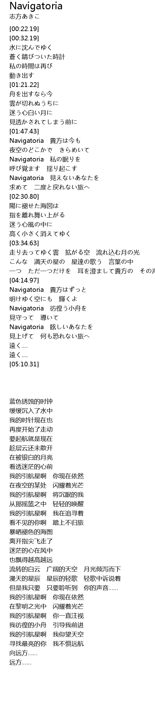 | [04:29.61] | Navigatoria 彷徨う小舟を |