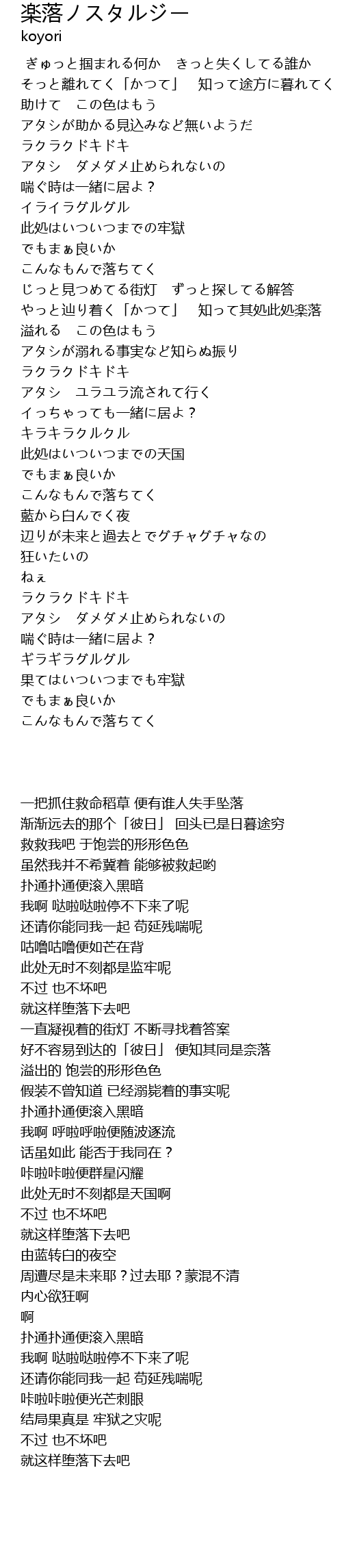 | [01:58.74] | やっと辿り着く「かつて」 知って其処此処楽落 |