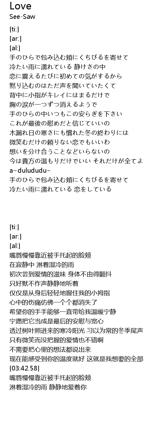 | [00:13.01] | 手のひらで包み込む頬にくちびるを寄せて |