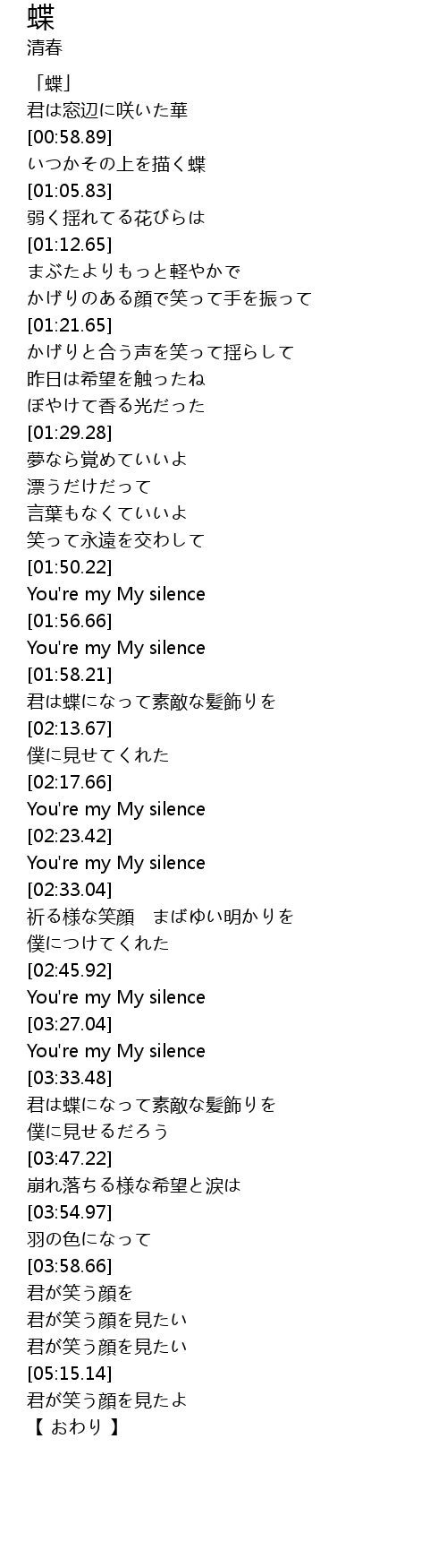 | [01:02.02] | いつかその上を描く蝶 |