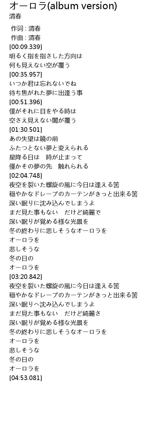 | [04:24.712] | 冬の終わりに悲しそうなオーロラを |