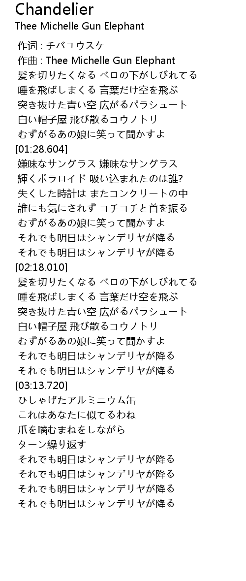 | [00:01.000] | 作曲 : Thee Michelle Gun Elephant |