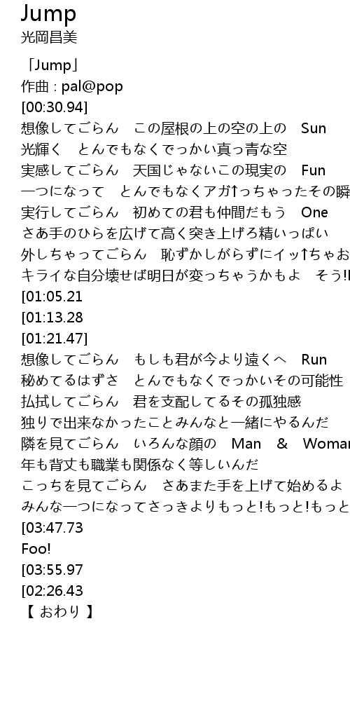 | [04:12.22][03:55.97][03:39.72][02:18.43] | 未来を目がけて飛ぼう!ほら元気出して Jump! |