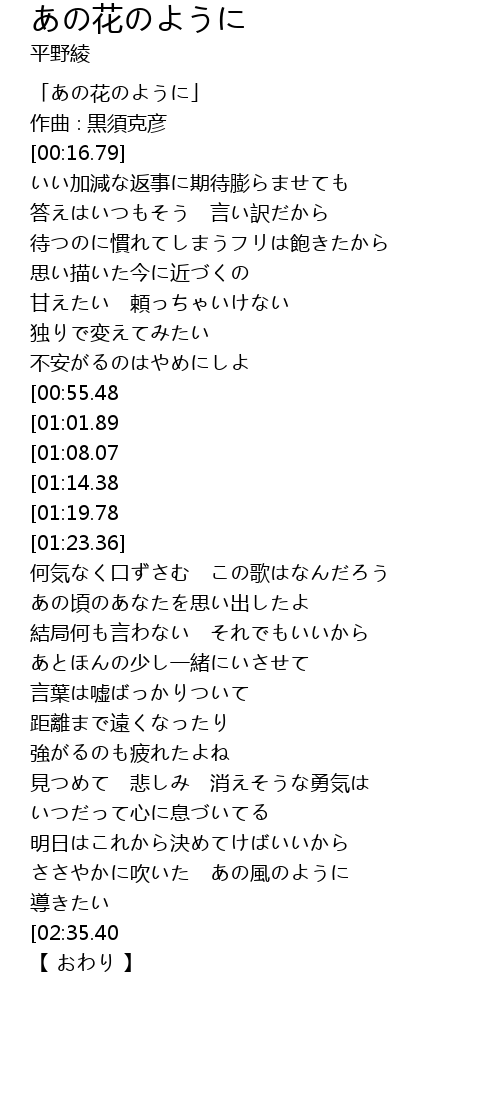 | [03:15.61][01:14.38] | 臆病に咲いた あの花のように |
