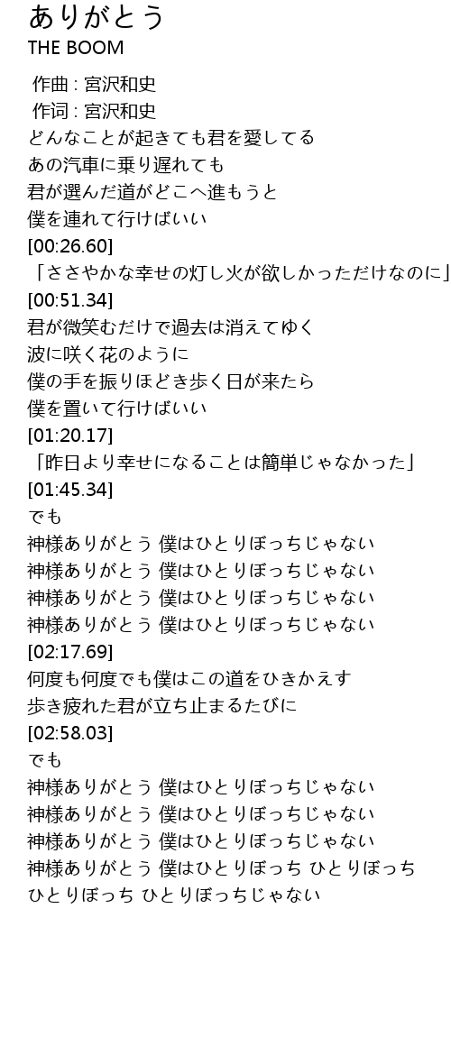 | [03:22.01] | 神様ありがとう 僕はひとりぼっち ひとりぼっち ひとりぼっち ひとりぼっちじゃない |