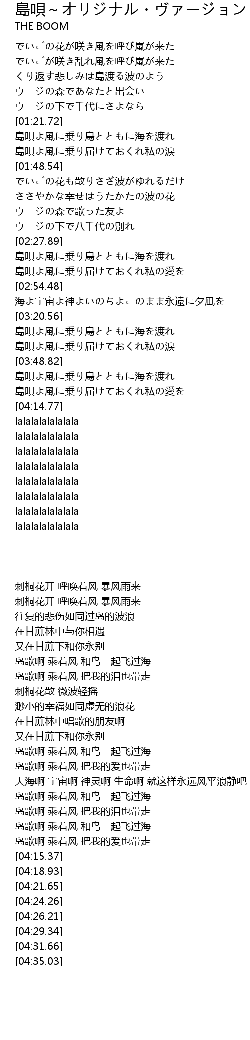 | [03:22.40] | 島唄よ風に乗り鳥とともに海を渡れ |
