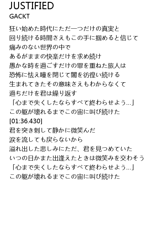 | [01:26.700] | この躯が壊れるまでこの宙に叫び続けた |