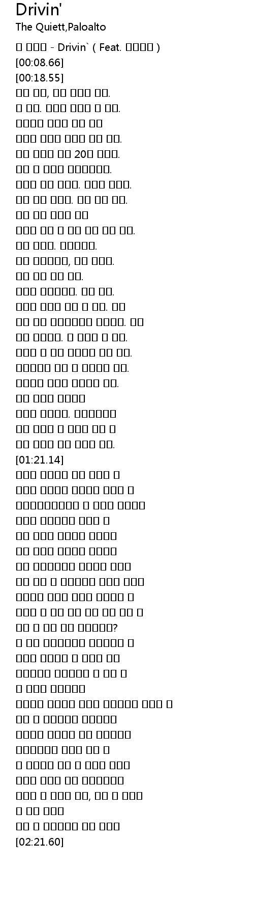 | [00:00.60] | 더 콰이엇 - Drivin`(Feat. 팔로알토) |