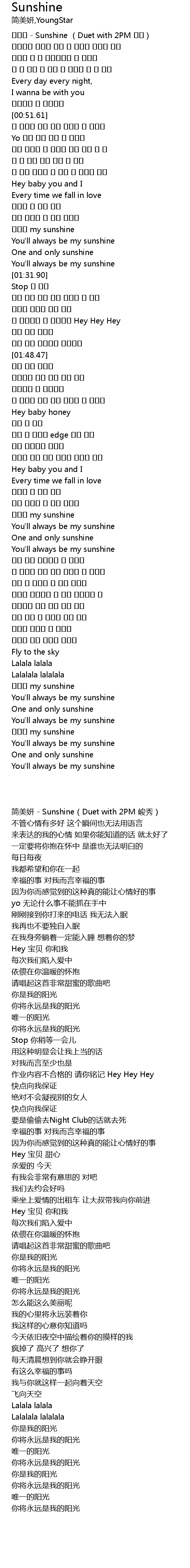 | [00:00.54] | 简美妍 - Sunshine(Duet with 2PM 峻秀) |