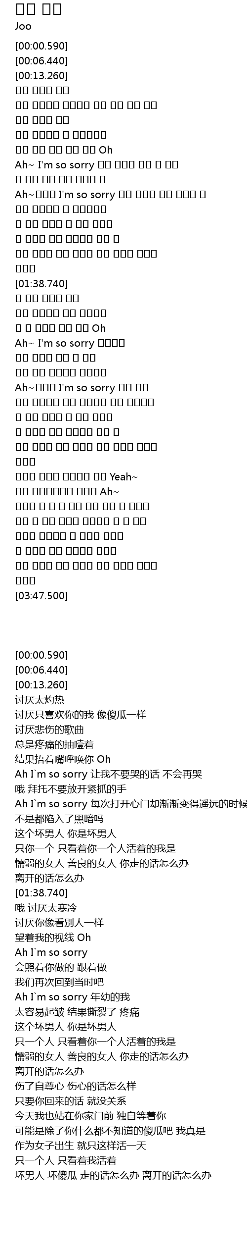 | [00:43.250] | Ah~ I'm so sorry 울지 말라면 다신 안 울게 |