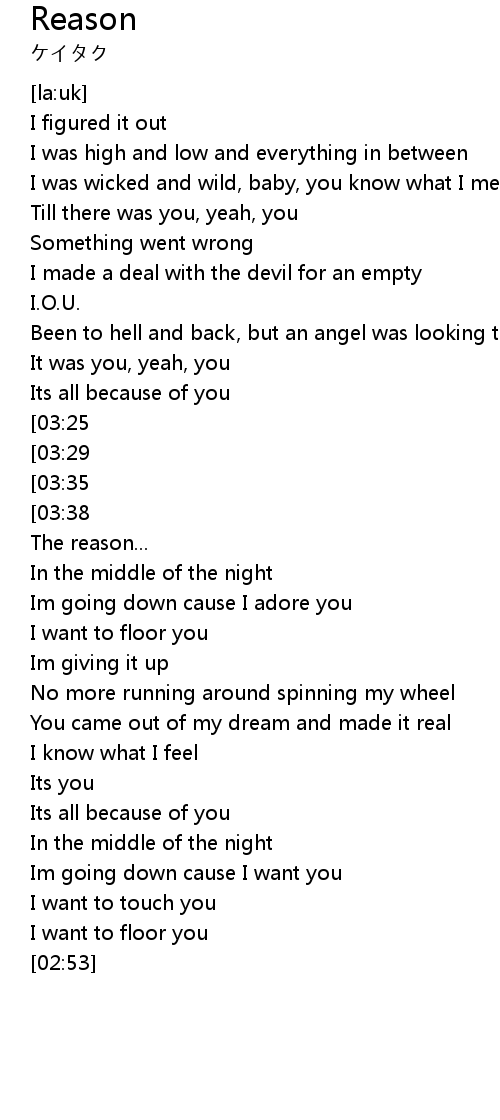 | [03:57][03:38][02:22][01:19] | You are the reason, the reason |